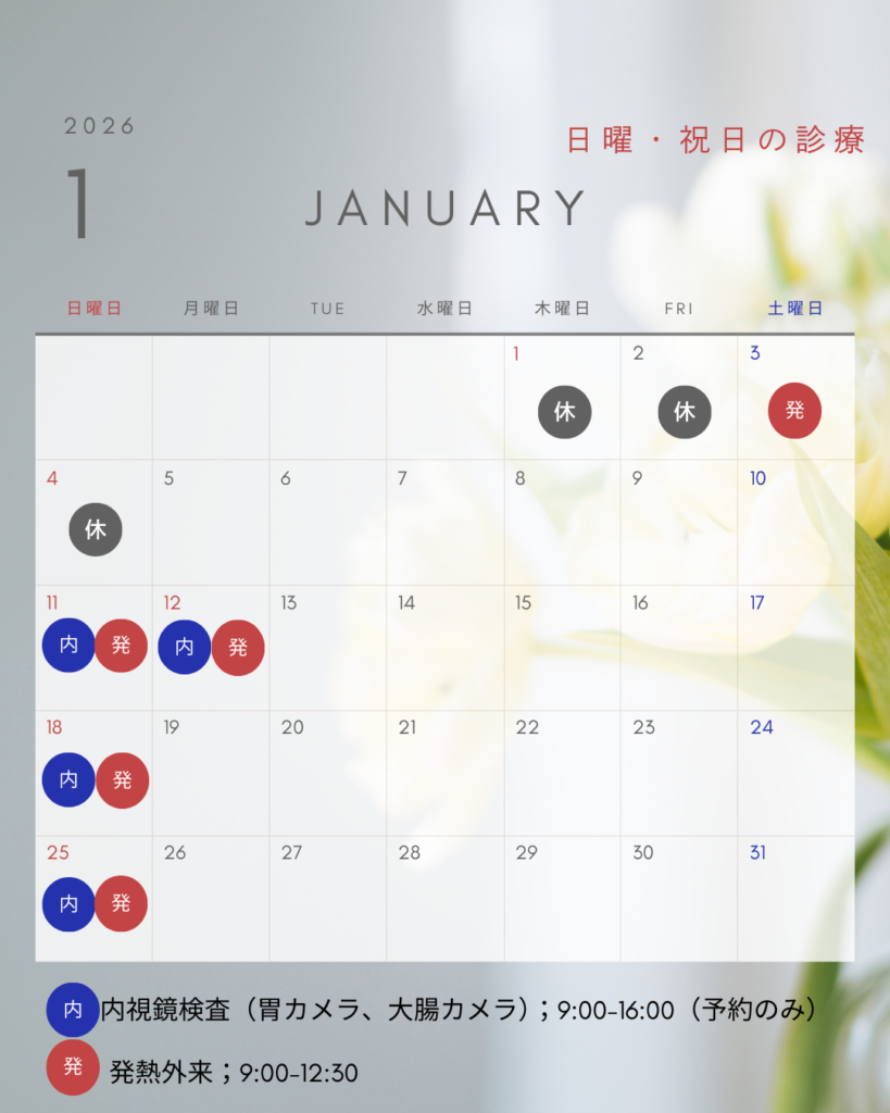 1月の日曜・祝日は、内視鏡検査(胃カメラ・大腸カメラ)および発熱外来のみを実施いたします。